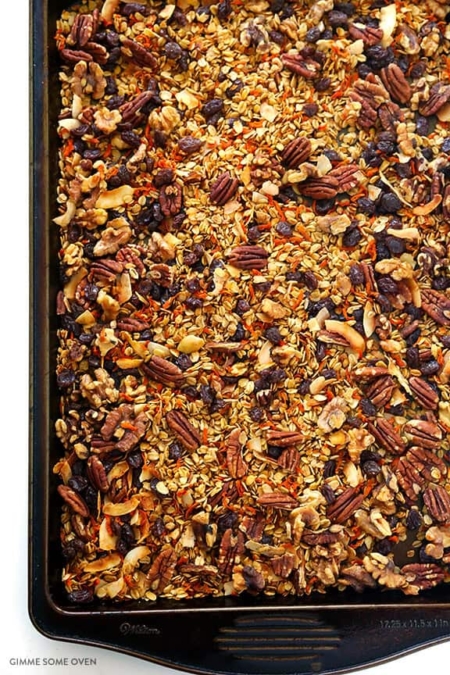 Homemade carrot cake granola with oatmeal, shredded carrots, walnuts, pecans, coconut, raisins, flax seed, and maple syrup. 16 ounces. Gluten and dairy free.