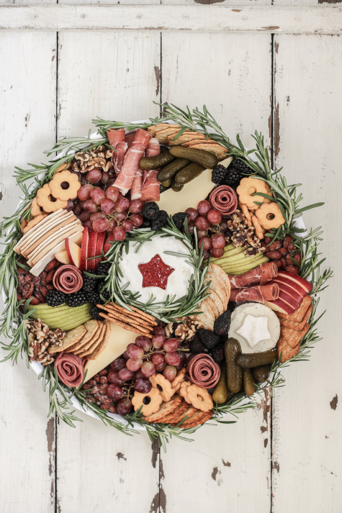 Wreath inspired cheese and charcuterie board with holiday cookies, crackers, and fresh fruit.