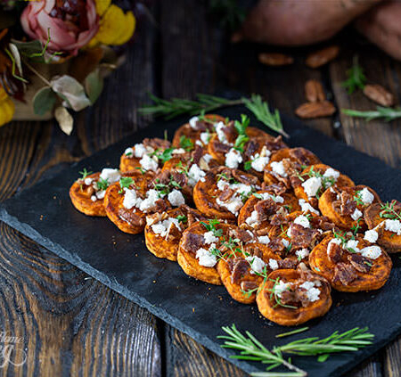 Roasted sweet potatoes with bacon jam, goat cheese and chives